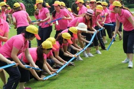 1.为每位学员分发一根PVC管,要求将每个人的管子连接在一起,然后将一个高尔夫球放在起始点的PVC管中,开始向终点的p子滚动, 最终要成功地将球落在放在地面的杯子里,通常在项fi弁始时,离杯子 最近的学员距离杯子是4米左右。