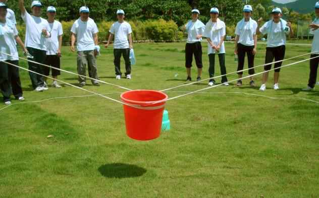 绳子、4条橡皮筋和4个眼罩,要求组 员将一个摆设在大约2米x2米范围中央的“核废料”(一杯水〗,在不 利用其他工具的情况下运到指定的地方#镑